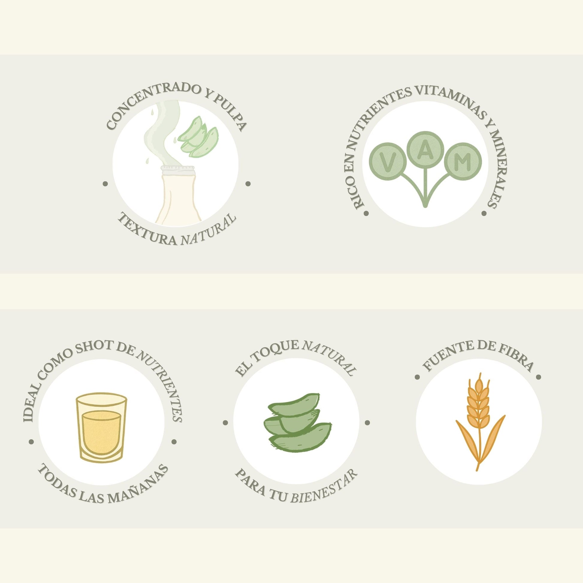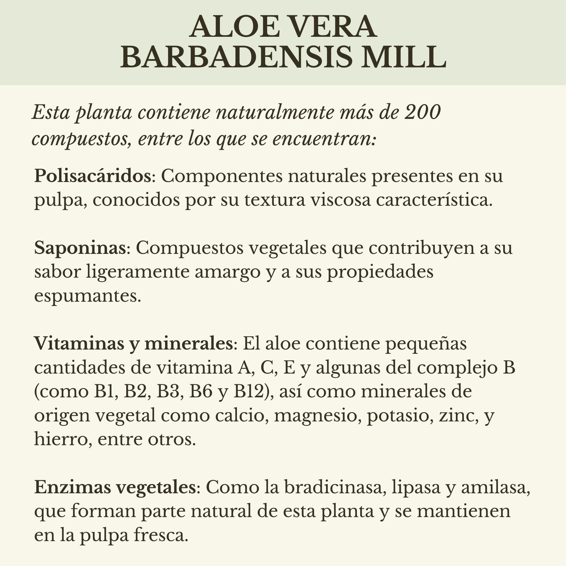 Aloe barbadensis Mill 60% pulpa y 40% concentrado, Ácido Cítrico y Sorbato de Potasio (Sorbus Acuparia).