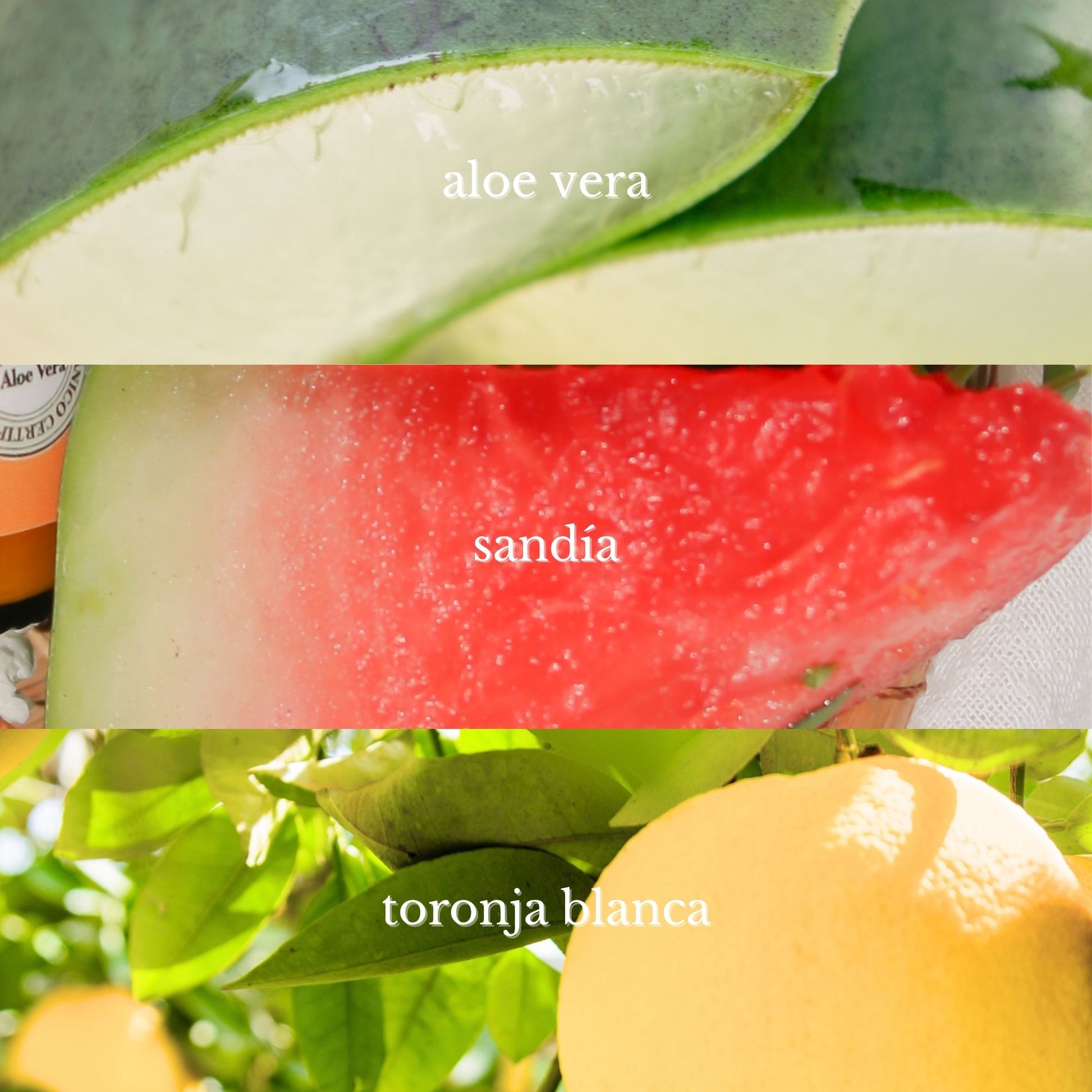 54% en vol. Aloe Vera (Aloe Barbadensis Mill) 100% orgánico certificado por la USDA, Bis-etilhexiloxifenol metoxifenil triquina, etiljexsalicilato, octocrileno dioxido de titanio, dicitrato-Estearato poliglicerilo-3, sutil metoxidibenzoilmetano, ciclopentasiloxano, tietil citrato, extracto de sandía (Citrullus Lanatus), glicerina U.S.P., aceite de cáscara de toronja blanca (Citrus grandis), disodio laurilpropionato tocoferil fosfatos, goma xantana, alantoína, citrato de sodio, trimetoxicaprililsilano, clorfenesina, benzoato de sodio (menos del 0.07%), metilsotiazolinona.