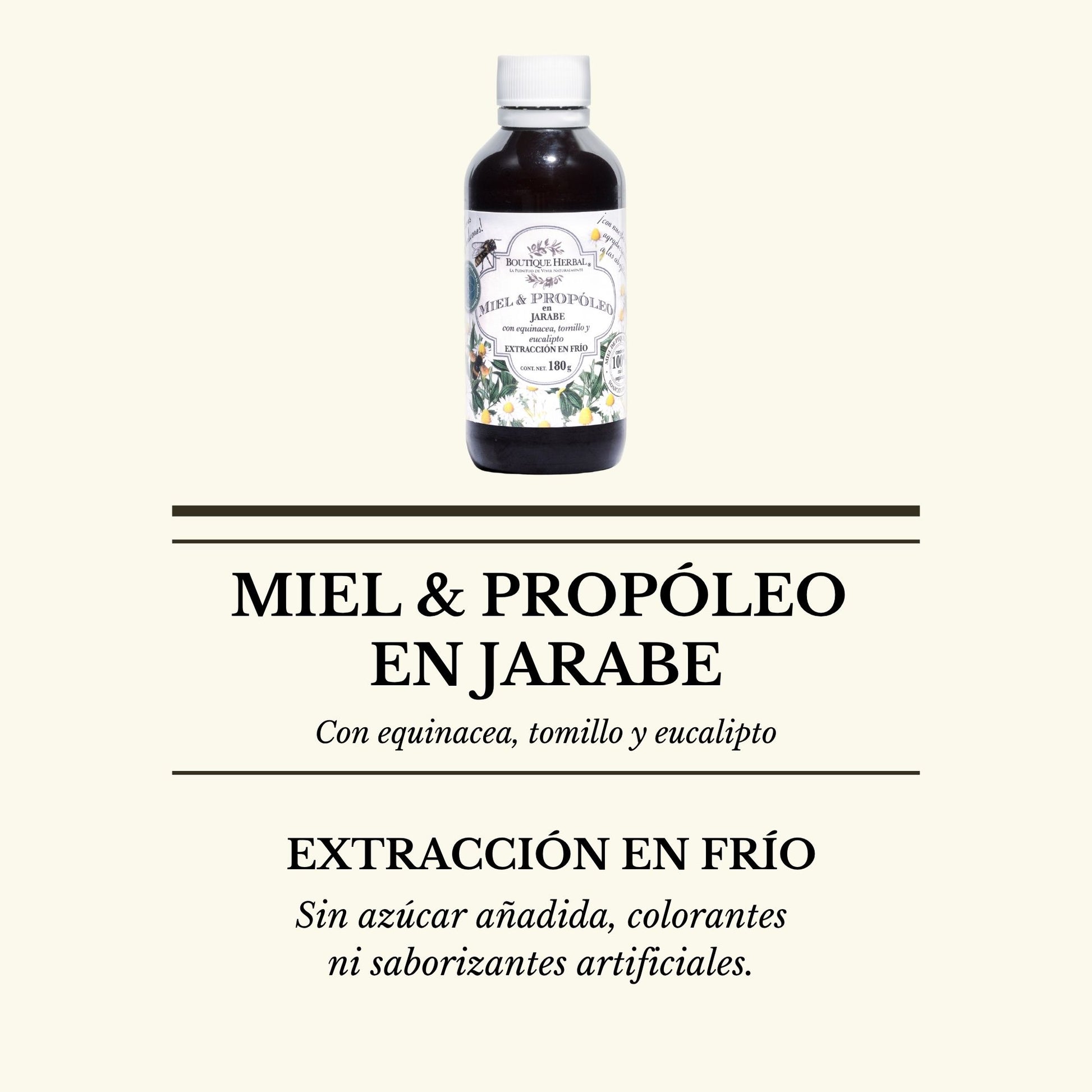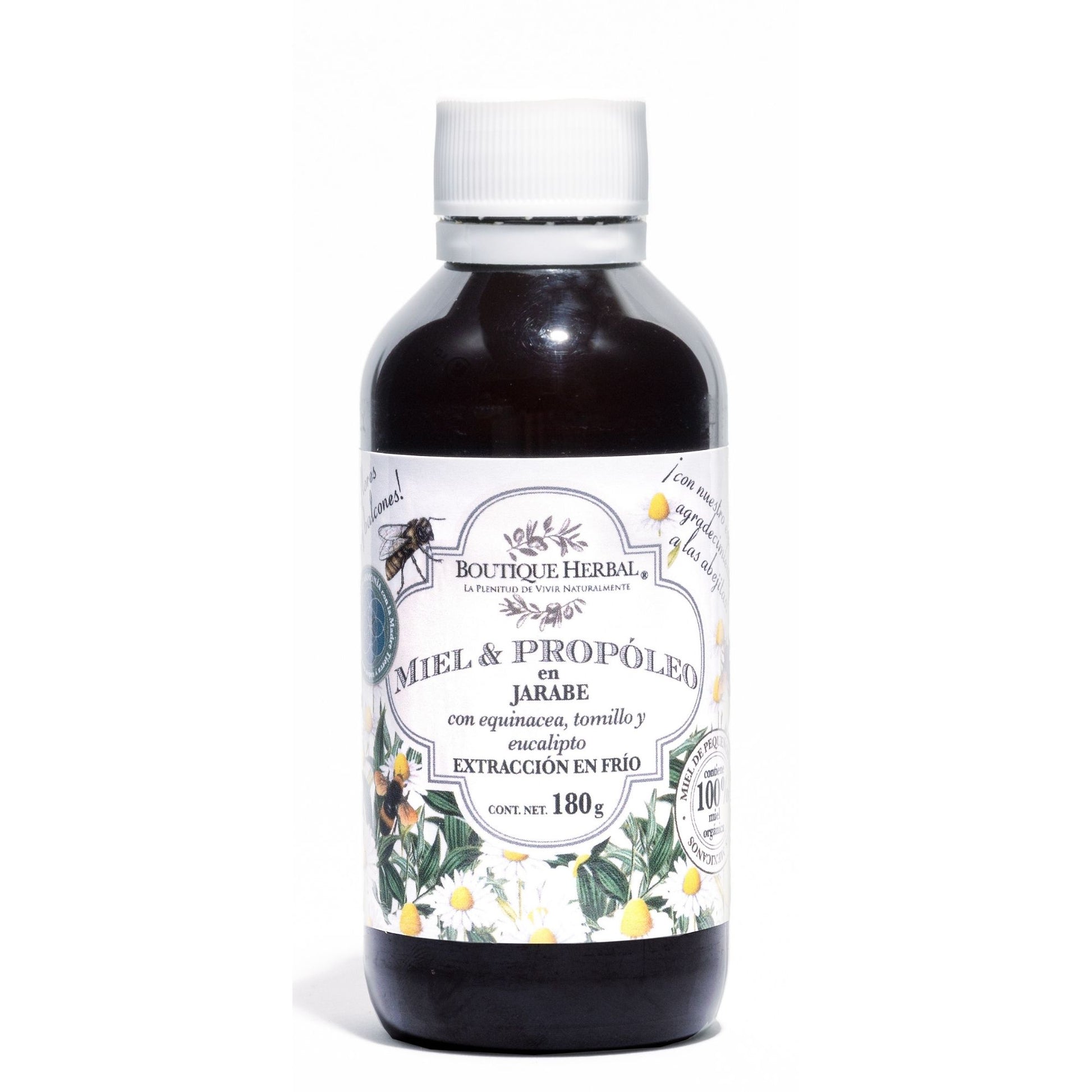 Miel orgánica, propóleo orgánico, equinácea, extracto de tomillo y eucalipto.