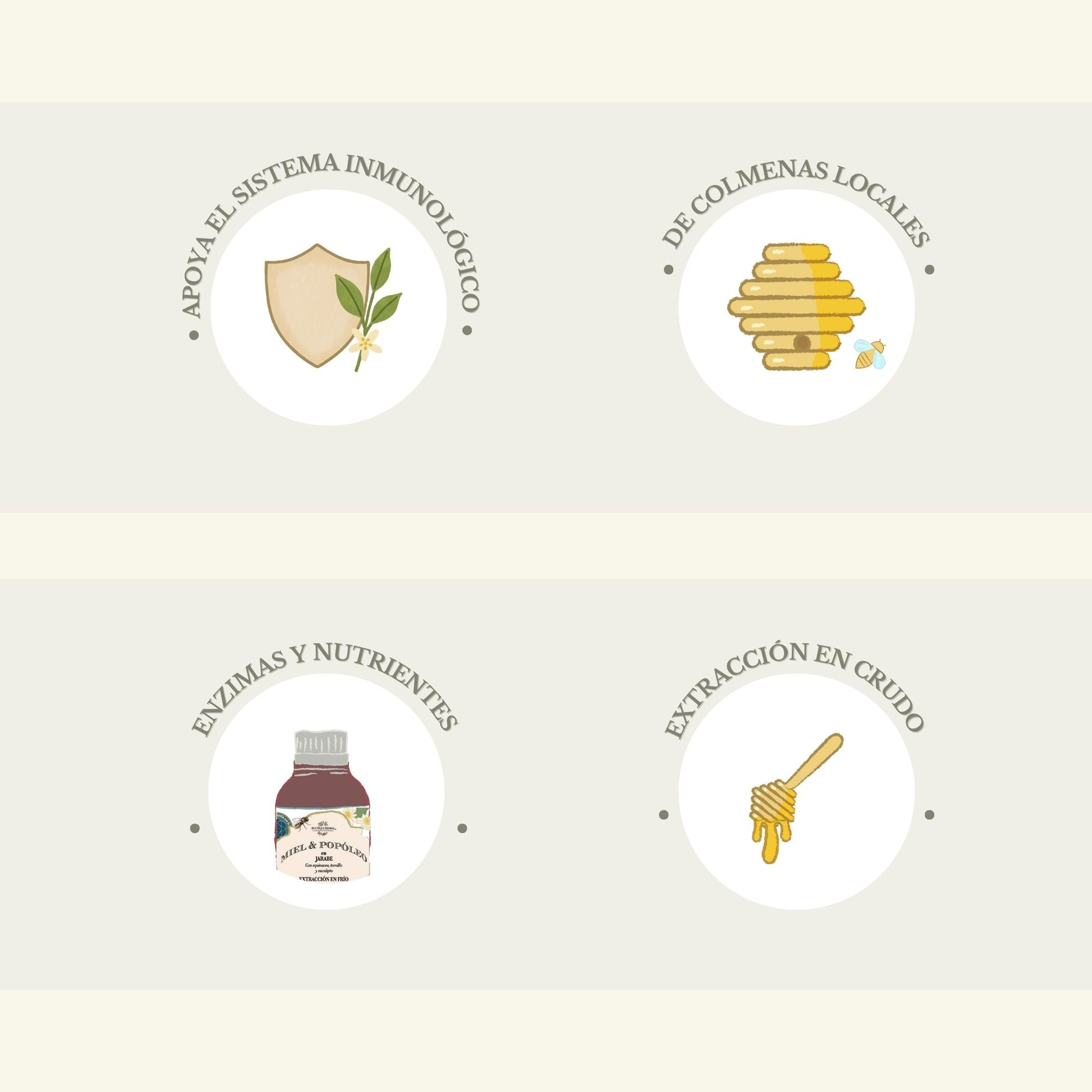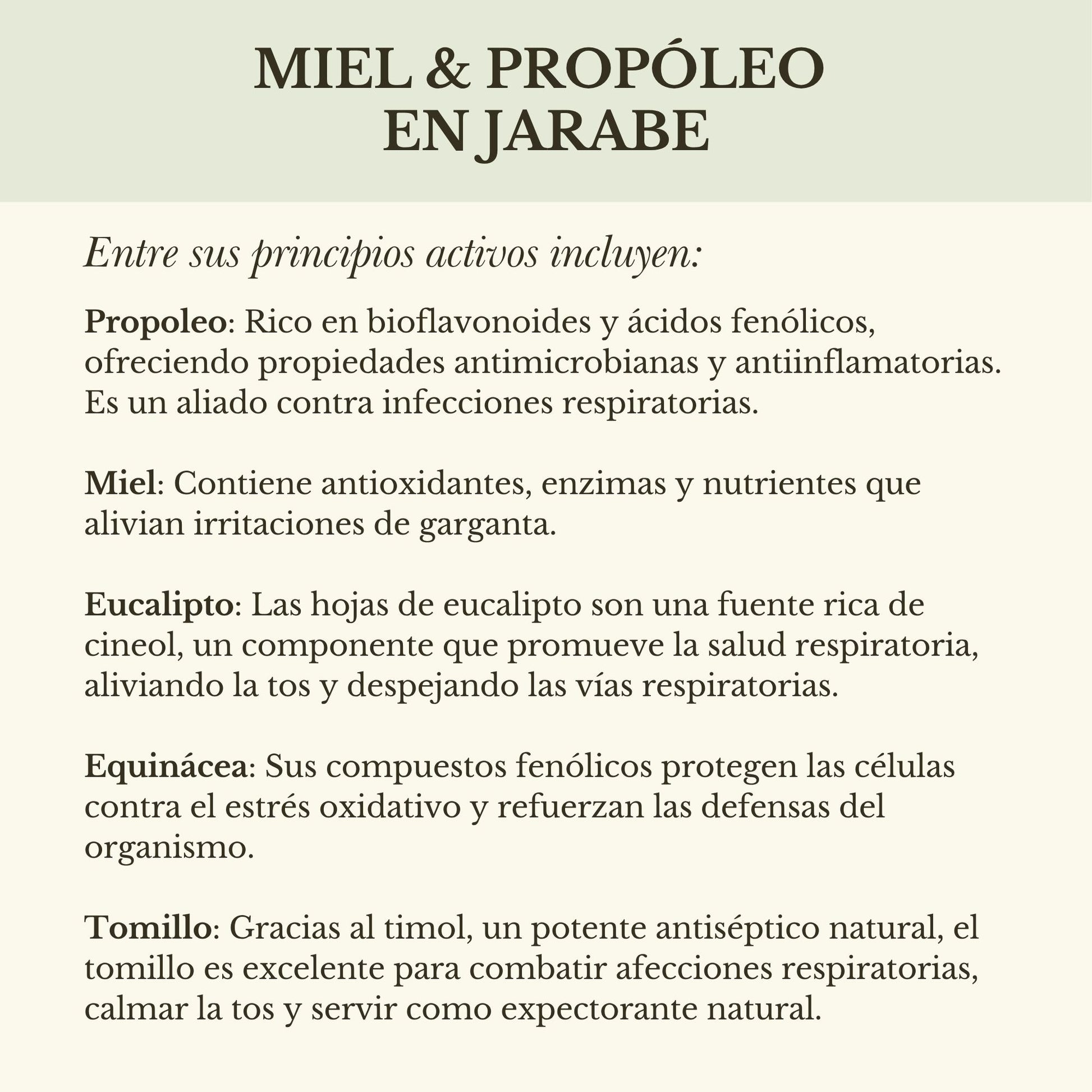 Propoleo: Rico en bioflavonoides y ácidos fenólicos, ofreciendo propiedades antimicrobianas y antiinflamatorias. Es un aliado contra infecciones respiratorias.