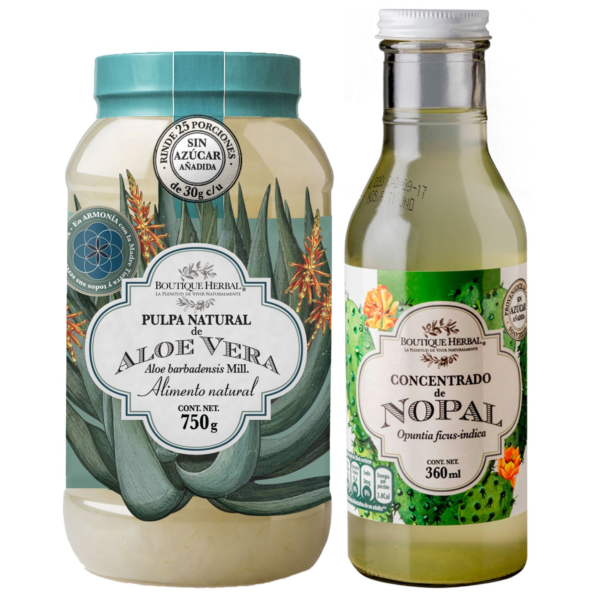 Incluye: 1 Pulpa Natural de Aloe Vera (750gr) y 1 Concentrado Natural de Nopal (360ml)