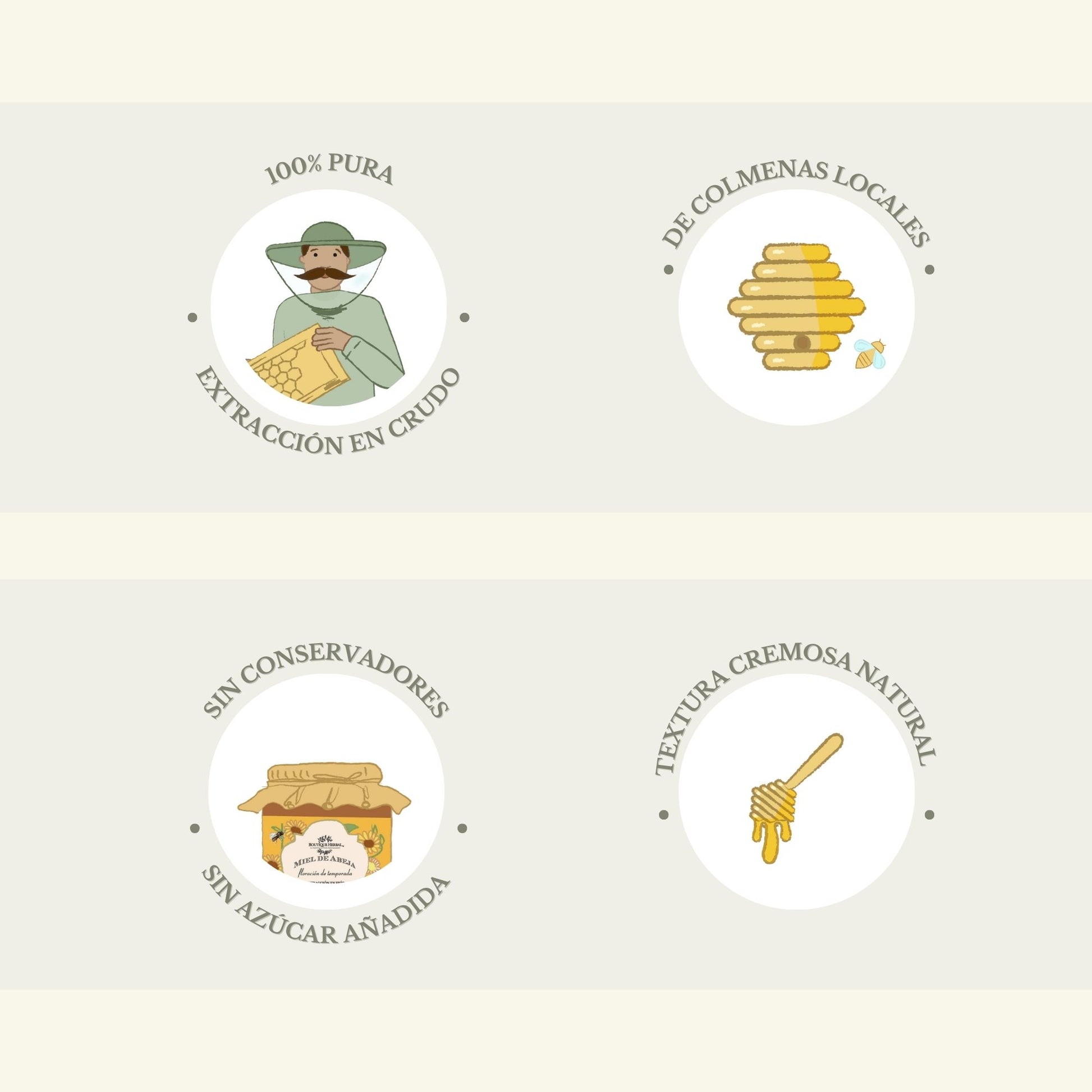 100% miel orgánica de abeja. Sin conservadores, colorantes, saborizantes, adulterantes, ni tratamientos que alteren su estado y composición natural.