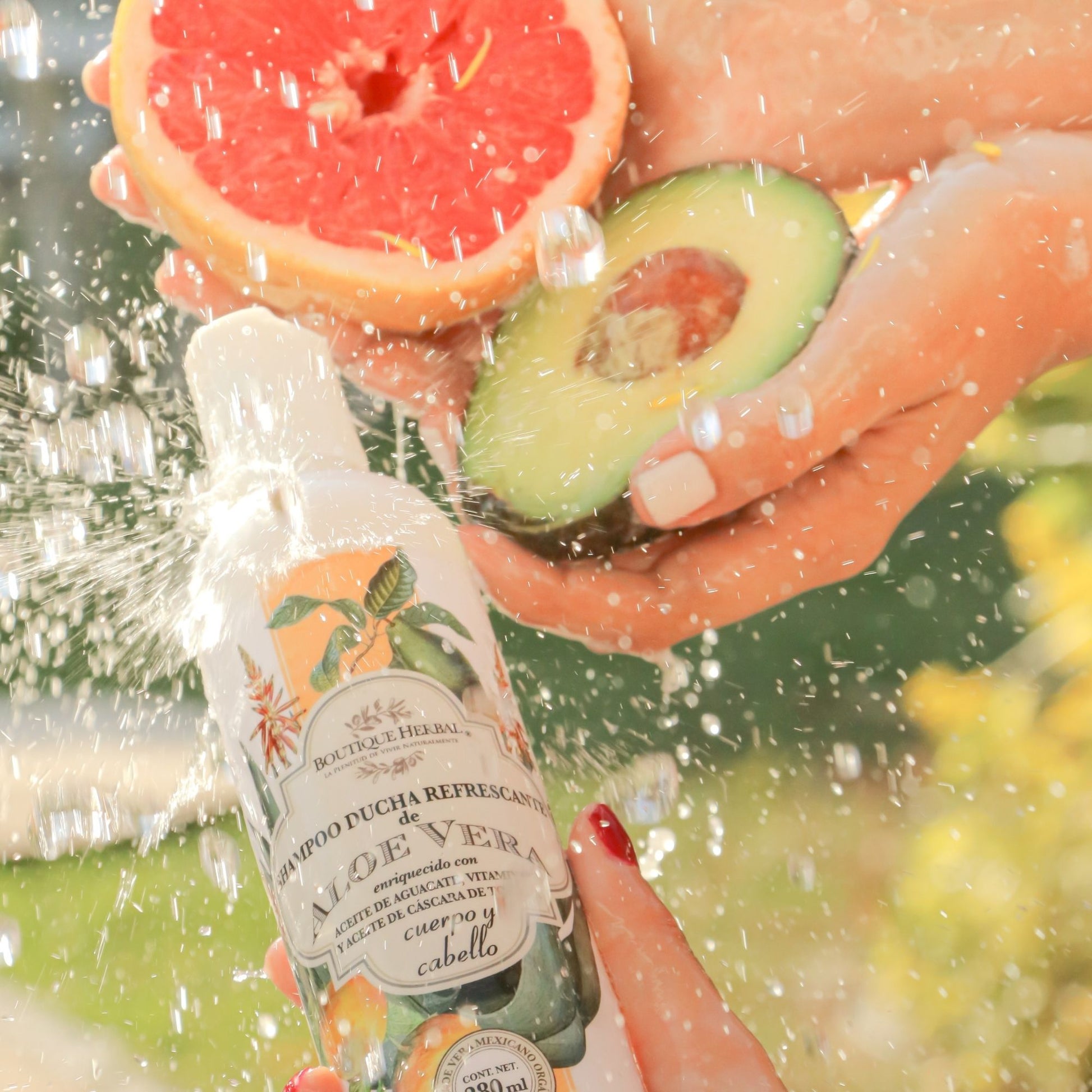 Jugo de hoja de Aloe Vera (70% Aloe Barbadensis Mill), Sodio C14-16 sulfonato de olefina, cocamidopropil betaína, glucosio de coco, policuaternio -39, cloruro de sodio, fragancia, aceite de cáscara de toronja blanca (Citrus grandis), aceite de aguacate (Persea Gratissima), tocoferol, ácido cítrico, benzoato de sodio.