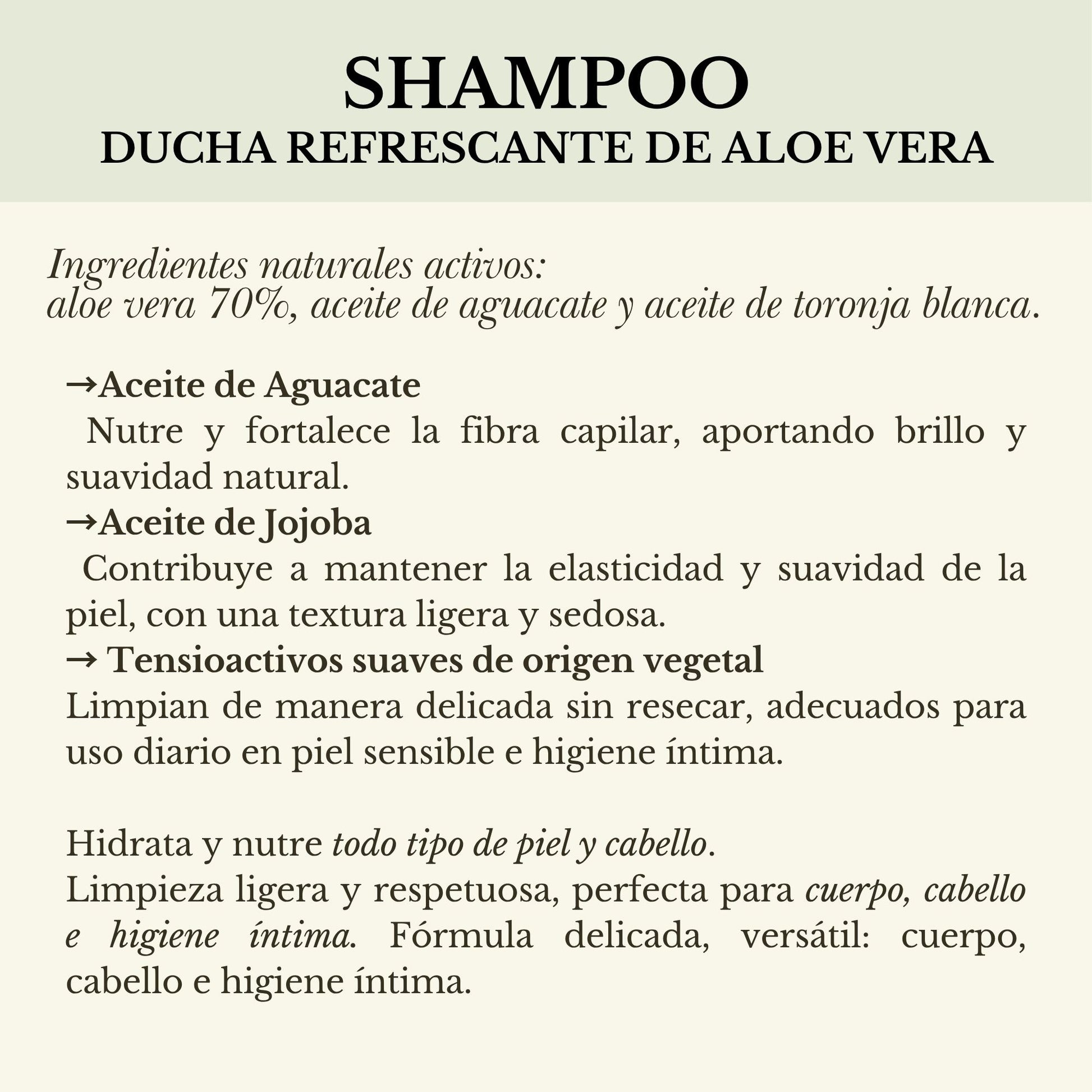 Hidratación natural: gracias al alto contenido de aloe vera orgánico (70%), que ayuda a mantener la piel y el cabello frescos y suaves.
